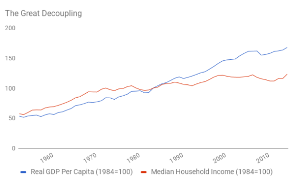 大约在1986年,美国收入与GDP增长之间的传统相关性被打破,这被称为“大脱钩”。资料来源:《World After Capital》。